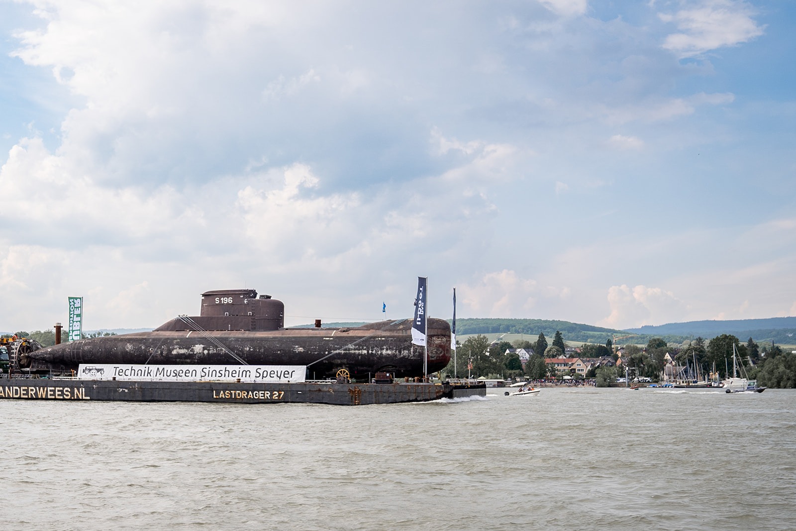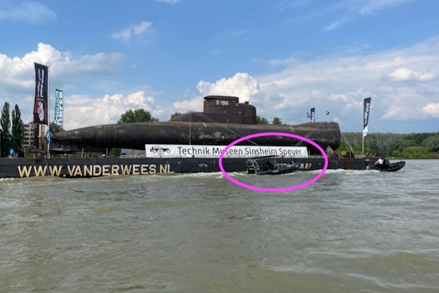 Der jetzt schon legendäre Transport des ehemaligen Marine-Unterseeboots U17 von der Marinebasis Eckernförde über die Niederlande flussaufwärts nach Speyer hatte bereits in den vergangen Tagen viele Schaulustige ans Ufer des Rhein gelockt. Bei herrlichem Sonnenschein und inzwischen angenehmeren Temperaturen war das am 15. Mai nachmittags auch vor Walluf nicht anders zu erwarten.