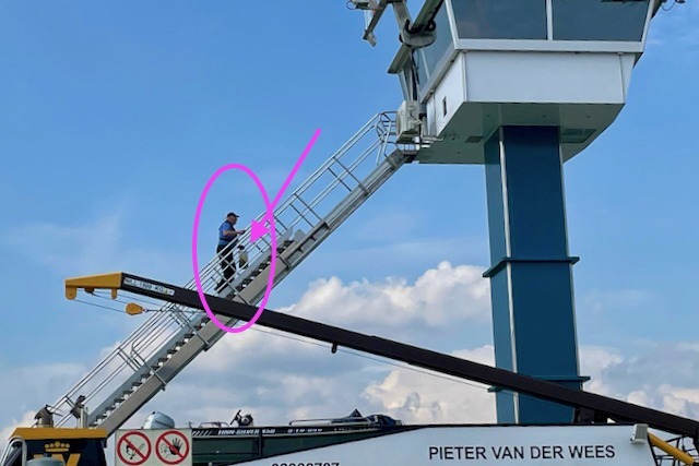Doch die Rettung nahte in Gestalt der Wasserschutzpolizei, die U17 begleitete und dessen Weg durch den rebellischen Rheingau sicherte. Nach einer kurzen telefonischen Kontaktaufnahme (Anruf Nummer drei) erklärte sich des Seglers Freund und Helfer bereit zu einer diplomatischen Auftragsmission. Der Riesling vom Weingut Markloff inklusive eines kurzen Grußschreibens in Deutsch und Niederländisch wechselte zunächst auf das Polizeiboot, dessen Besatzung fuhr dann unter Aufbietung allen seemännischen Könnens das Schubschiff an und übergab das Paket unversehrt und mit besten Grüßen der Gemeinde Walluf und des Segelclub Rheingau.