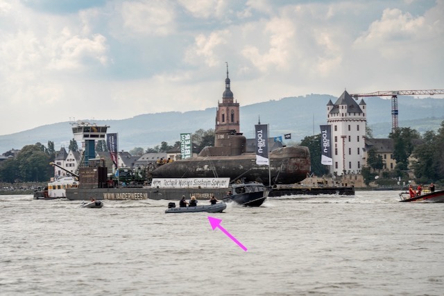 Auf dem Rhein war derweil reger Verkehr: DLRG, Feuerwehr und zahlreiche Yachten drängten sich im Fahrwasser. Zwischen Eltville und Walluf war es schließlich soweit. U17 (Schiffskennung S 196) wurde in Westsüdwest gesichtet. Der Koloss (50 m lang, 4,6 m breit und rund 500 t schwer) wälzte sich im Sonnenschein mit Steuerkurs 70 Grad den Rhein aufwärts. Direkt voraus! Die Torpedoklappen am Bug sahen gefährlich aus und wahrscheinlich würde der KaLeu im Kommandoturm auch schon erste Gegenmaßnahmen planen. Ob das Fahrwasser zwischen Stromkilometer 508 und 510 wohl tief genug für einen Alarmtauchgang wäre?